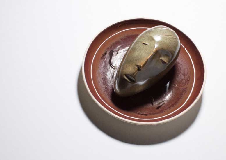 Sculptures by Hasseena Suresh, including Colours Speak the Politics – Red 1 (ceramic & wood, dry glaze stain).