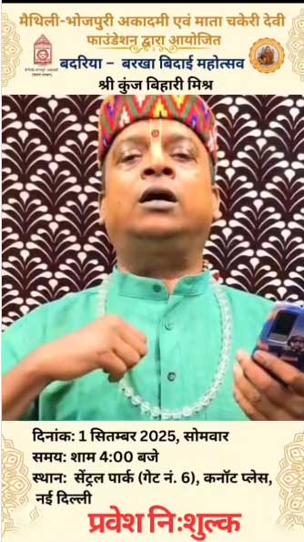 Organized by Mata Chakeri Devi Foundation in collaboration with the Maithili-Bhojpuri Academy, Govt. of NCT of Delhi (Department of Art & Culture), this event celebrates the traditional monsoon farewell with renowned artist Shri Kunj Bihari Mishra.