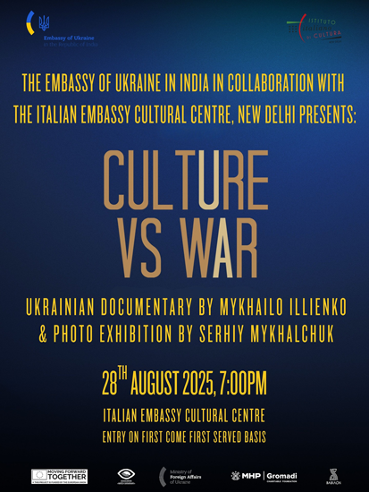 The Embassy of Ukraine in India, in collaboration with the Italian Embassy Cultural Centre, New Delhi, presents Culture vs War – a powerful documentary screening by Mykhaylo Illienko and a photo exhibition by Serhiy Mykhalchuk.