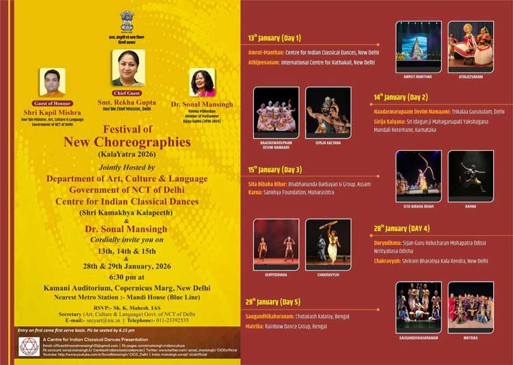 Jointly hosted by the Department of Art, Culture & Language, Government of NCT of Delhi and the Centre for Indian Classical Dances (Shri Kamakhya Kalapeeth), the festival presents original productions rooted in classical forms, mythology, literature, and contemporary thought.