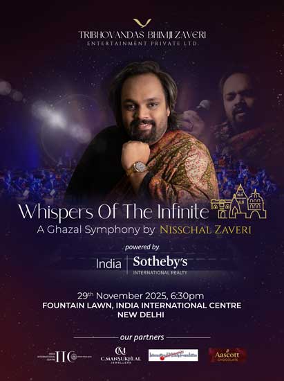 Discover a unique musical experience as ghazal singer and composer Nisschal Zaveri presents ‘Whispers of the Infinite’—India’s first-ever Ghazal Symphony combining Hindustani classical vocals and a 30-piece symphony orchestra. Enjoy a 90-minute journey where poetic verses are woven with contemporary arrangements, embracing ghazal, thumri, hori, chaiti, and kajri through soulful singing and rich harmonies.