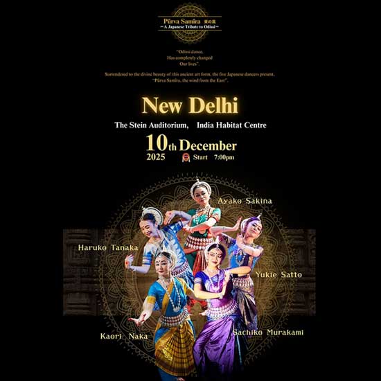 Experience the grace of Odissi through “Pūrva Samīra – A Japanese Tribute to Odissi”, an evening of classical Indian dance presented by five international artistes. The performance brings together Kaori Naka, Haruko Tanaka, Ayako Sakina, Yukie Satto and Sachiko Murakami, Odissi dancers from Japan and the USA, in a special tribute to this ancient art form.