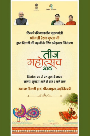 Delhi Tourism invites you to the Teej Mahotsav 2025, a vibrant cultural celebration dedicated to the women of Delhi. Organized under the leadership of Hon’ble Chief Minister Smt. Rekha Gupta, the festival promises an enchanting experience of tradition, festivity, and togetherness.