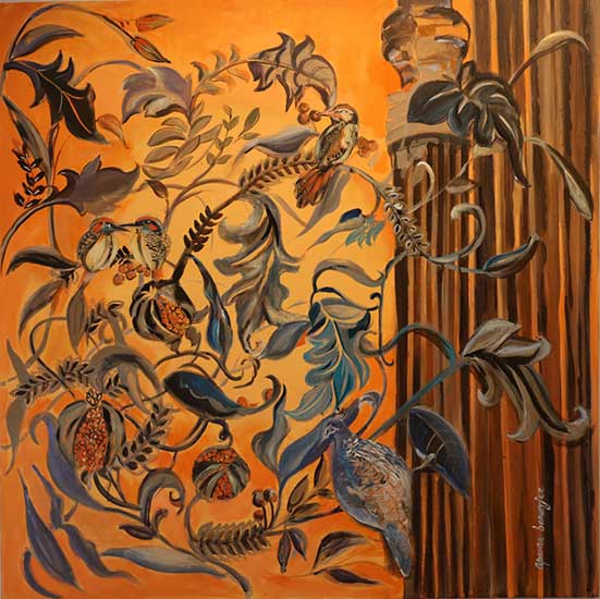In The Sacred Wild, Aparna Banerjee draws inspiration from her travels across the Silk Route and Southern India. Her canvases reflect landscapes, myths, and encounters with women whose strength and resilience deeply influenced her. Central to this exhibition are recurring motifs such as the deer, lotus, pomegranate, sacred pillars, and the mythical Ganda Berundah, symbolizing both conflict and harmony.